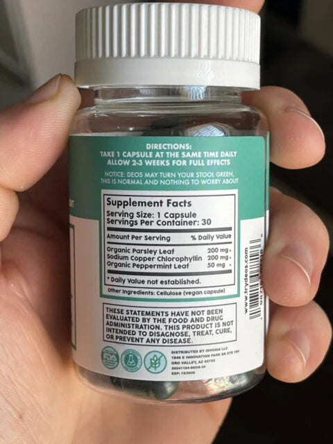 Cada cápsula combina lo mejor de la ciencia y la naturaleza para neutralizar el mal olor desde su origen. La clorofila natural desodoriza desde adentro, el carbón activado elimina toxinas, el extracto de menta refresca y apoya la digestión, y el magnesio equilibra el pH corporal. Una fórmula completa que trabaja desde el interior para que te sientas fresco, seguro y ligero cada día.